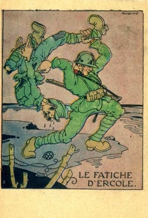 La Tradotta, 1918, Franchigia Militare. Serie I, cm 9x14, policroma, Firmata: RUBINO, in alto a destra